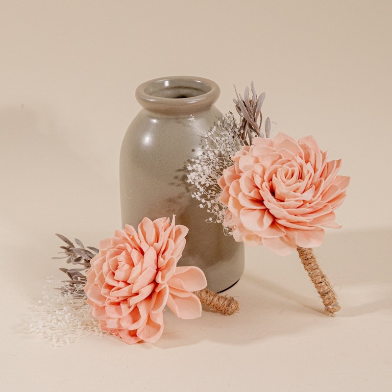 The color used in the finished productis Powder Pink. This father's boutonniere, with its tastefully selectedsola wood flowersandbeautiful greenery, provides a touch of class, perfectly symbolizing the proud role on your special day. Kit Includes: 3" Dahli