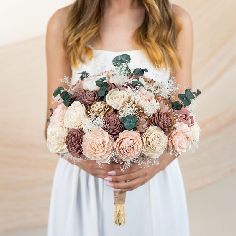 In the finished example shown we used the colors Mauve, Powder Pink, and Raw (No Dye).Our best selling bouquet is now available in a Extra Large size! This gorgeous bouquet contains a stunning assortment of our most popular flowers and filler. This gorgeous bouquet features eucalyptus and baby’s breath filler. The gorgeous assortment of sola wood flowers is perfect for your big day! Kit Includes : 60 Sola Wood FlowersSatin Washed Eucalyptus – Kelly GreenBaby’s Breath – WhiteBouquet Supply Pack1 oz Bottles of Wood Flower Dye (Choose Your Colors)60 Floral Wire StemsPlease note the DIY selection will come as a craft kit and is not a finished product. The build it for me selection will come as a finished product already assembled. The finished product in the example is for inspiration only, Flower types and sizes may vary depending on inventory availability.If Build It For Me is selected, the APPROXIMATE dimensions for your finished bouquet are as follows -Height – Approximately 14″ – 15″Width – Approximately 13″ – 14″