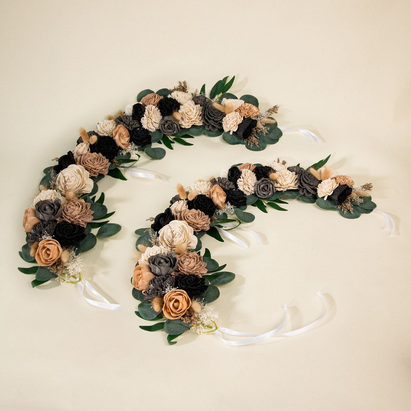 The colors used in the finished example shown are White Wedding, Grey, Black, Hazelnut. This beautiful Arch will add the perfect touch of greenery to your wedding or home decor!Add Sola Wood Flowers, additional fillers, or whatever else you can think of. T
