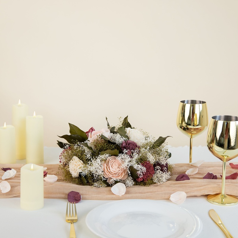The colors used in the finished example shown are Powder Pink, Eggplant, Burgundy and Raw (No Dye). This centerpiece kit contains everything you need to create this look. Kit Includes: 12 X Sola Wood Flowers Bamboo Stems Baby's Breath - White Salal - Green