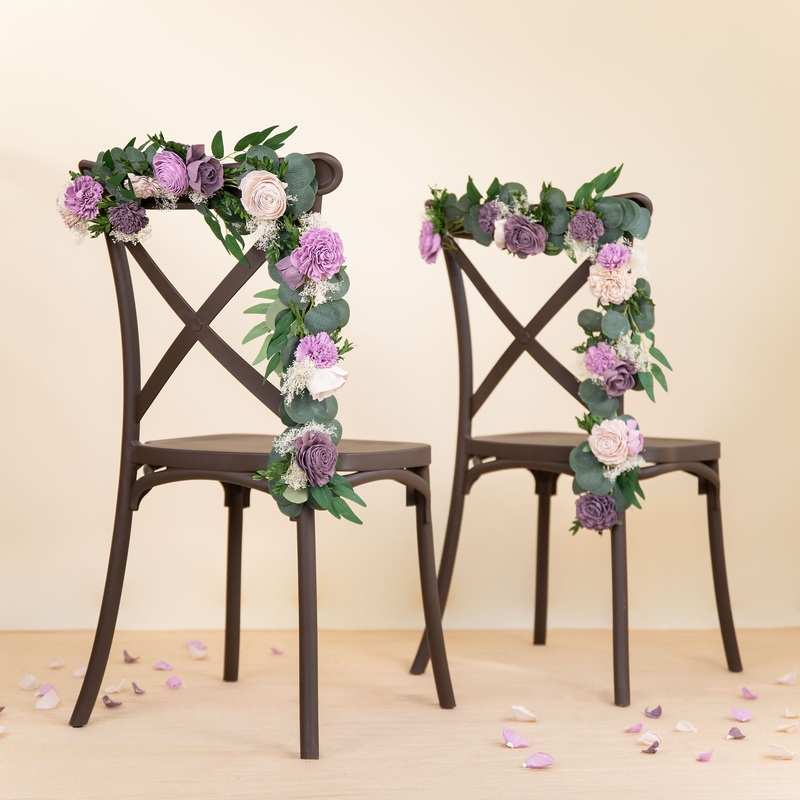 Hanging Chair Back Decoration - Zen Garden Colors used in the finished example shown are White Frost, Lilac, Frosted Mulberry. Kit Contains: 24 X Sola Wood Flowers 2 X Greenery/Fillers Boxwood Greenery Baby's Breath - White 4 X Supplies 2 X Eucalyptus Garl
